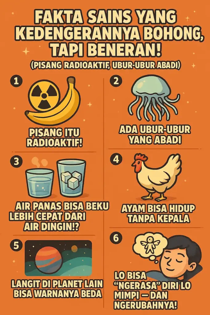 Fakta sains tuh emang kadang terdengar kayak dongeng, tapi justru di situ serunya. Dari pisang radioaktif sampai ubur-ubur abadi, semua nunjukin satu hal: dunia ini penuh keanehan yang keren banget buat lo eksplor.