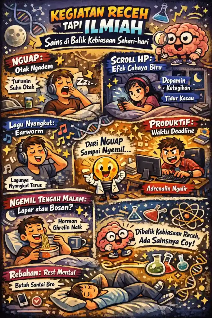 Lo pernah mikir nggak sih, kalau kebiasaan receh yang sering lo lakuin tiap hari itu ternyata ada penjelasan ilmiahnya? Dari kebiasaan nguap pas ngantuk, scroll HP sebelum tidur, sampai kenapa lo suka tiba-tiba pengen ngemil tengah malam. Kelihatannya sepele, tapi sains bilang: “Bro, itu ada alasannya.”
